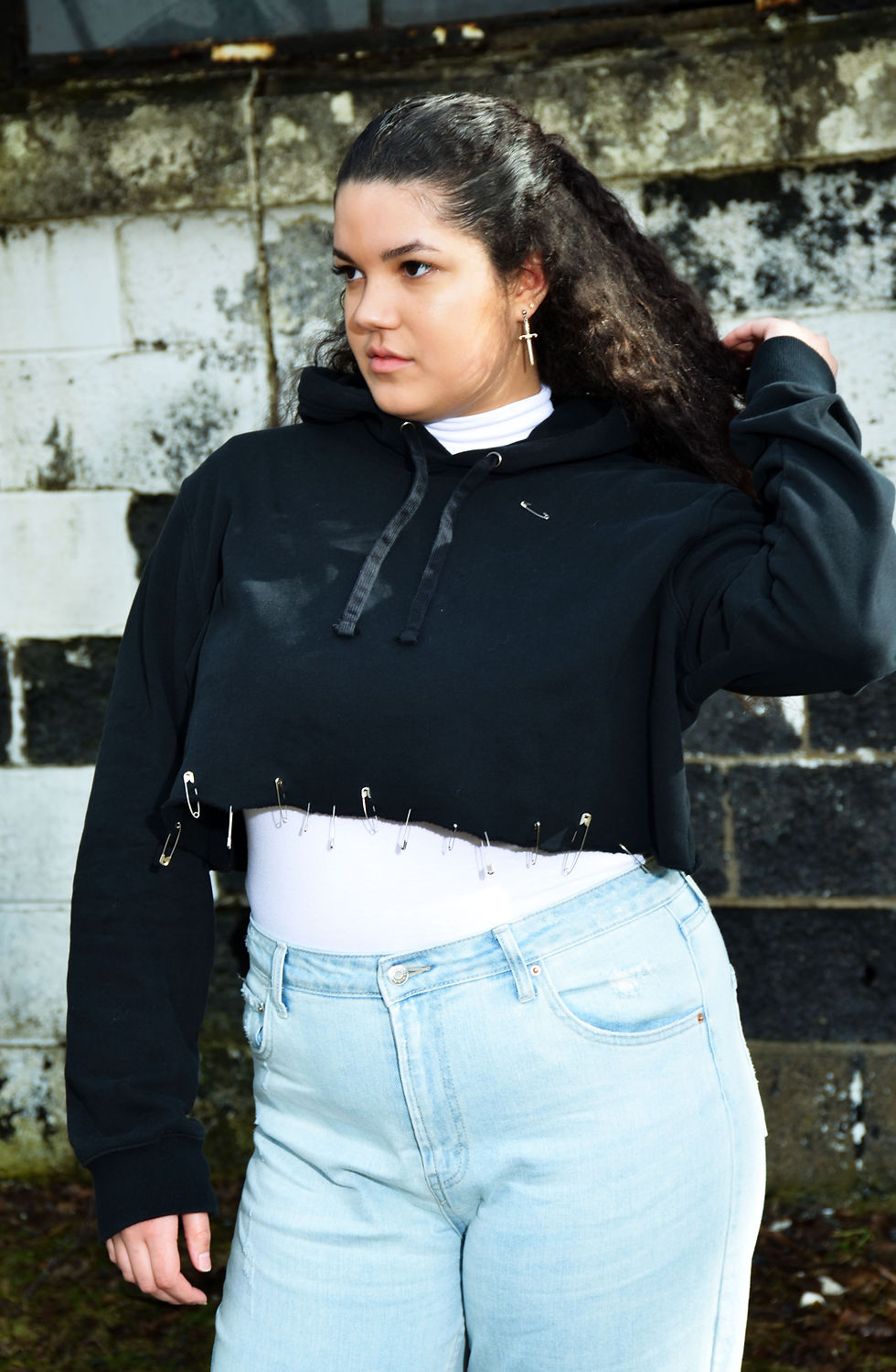All I needed to create this piece is a sweatshirt, safety pins, and scissors. I already had some safety pins and scissors at home to use (if you don’t they’re really inexpensive to buy). I bought an all black hoodie from Target for about $20. It was a basic sweatshirt with a kangaroo pocket - which gave me the perfect guideline to cut along and make it cropped. But if I were to do this again I would buy a larger size or a sweatshirt without a pocket so I could have more control over exactly how cropped I wanted it to be.